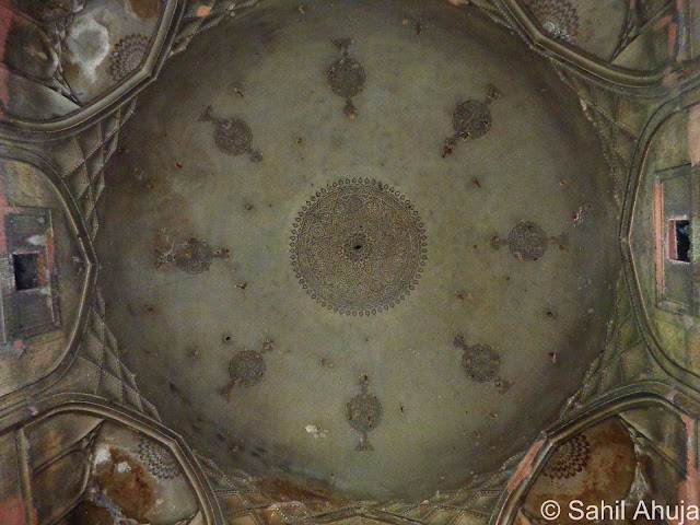 Slightly above the entrance, a band of calligraphy runs horizontally along the length of the wall. The four sides are also pierced by arched windows & small square ventilators located just below the room. All in all, the chamber presents a picture of subdued magnificence, artistic excellence as well as knowledge of functional aesthetics – somehow the Mughals innovated with arches, domes & openings to ensure that the structures they built remained considerably cooler than their surroundings – a feature observable inside this mausoleum. In complete contrast to the heat outside that threatened to set ablaze trees, stone & beings alike, in here it was cooler, I could have sit down & stayed there all day long. That & the presence of the big cuboid tombstone that covers much of the area within the chamber – doesn’t it look like a king-size bed?? I’m getting ideas in my head, it is said that you should not step on graves for fear of waking the sleeping spirits, what about sleeping on one?? Are there any rules regarding it?? Metcalfe stayed in Quli Khan’s Tomb, if you ignore the fact that he died of poisoning, nothing much happened to him, at least not on account of the spirits (refer Pixelated Memories - Quli Khan's Tomb).